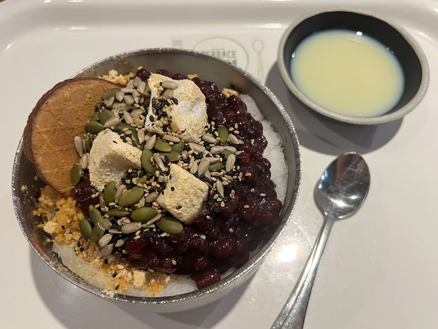 딸기 눈꽃빙수도 있었지만 왠지 오리지널 팥빙수가 먹고 싶어서 전설의 팥빙수를 시켰습니다. 해바라기 씨앗인지 견과류와 콩가루가 들어있어서 고소하고 맛있는 팥빙수입니다.